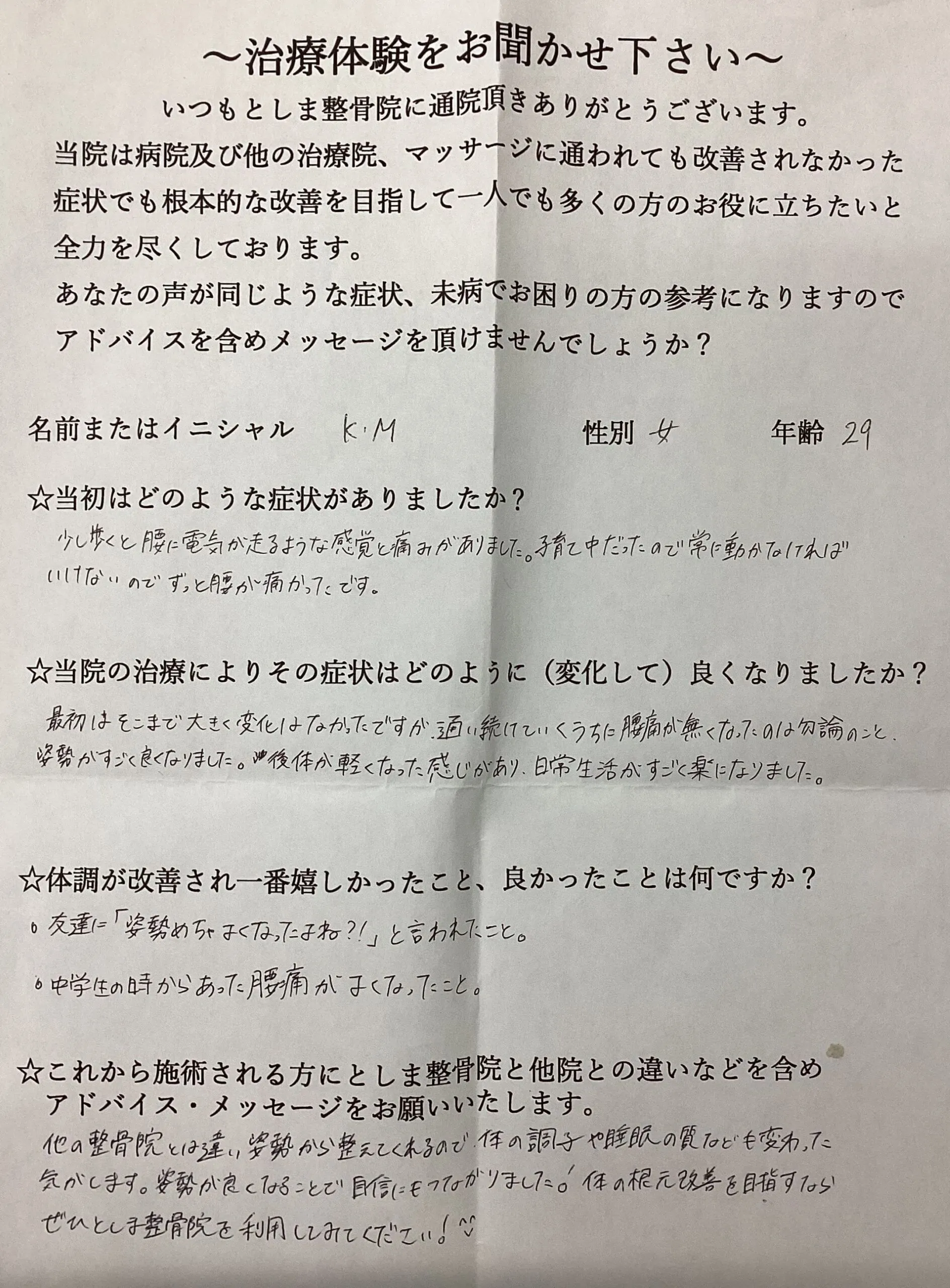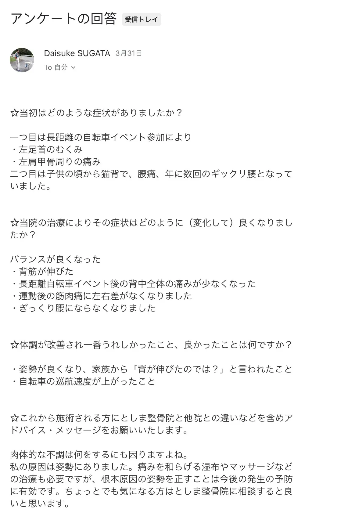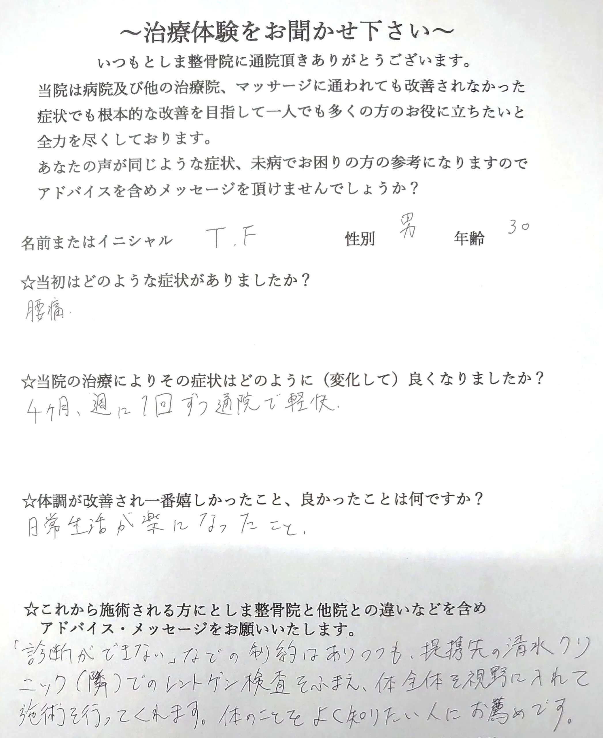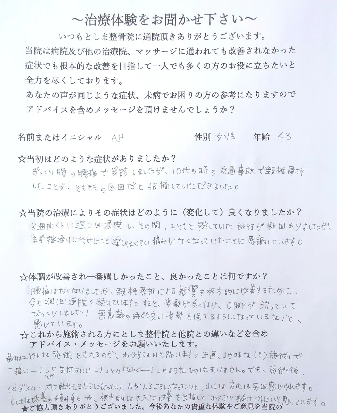 ☆これから施術される方にとしま整骨院と他院との違いなどを含めアドバイス・メッセージをお願いいたします。