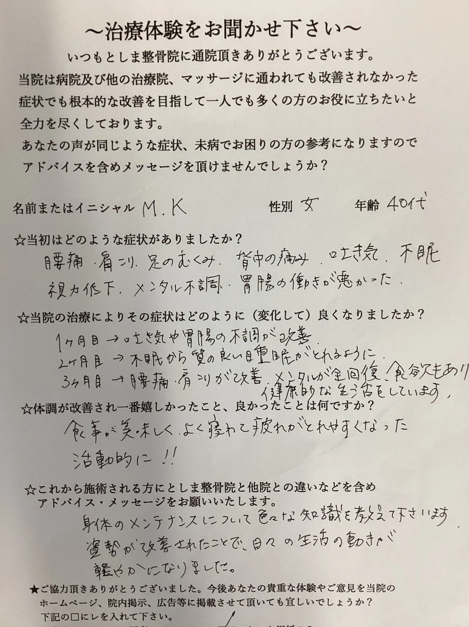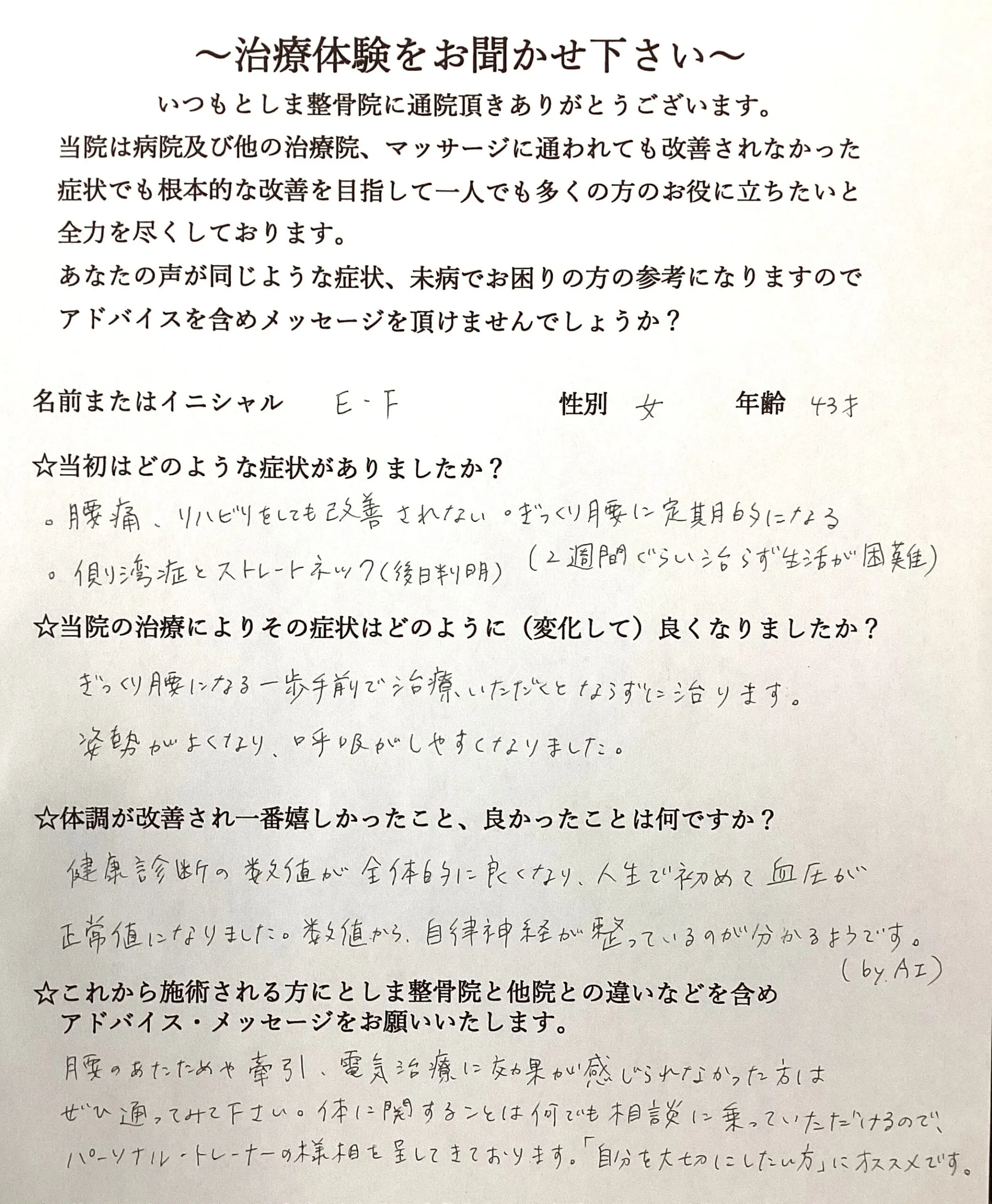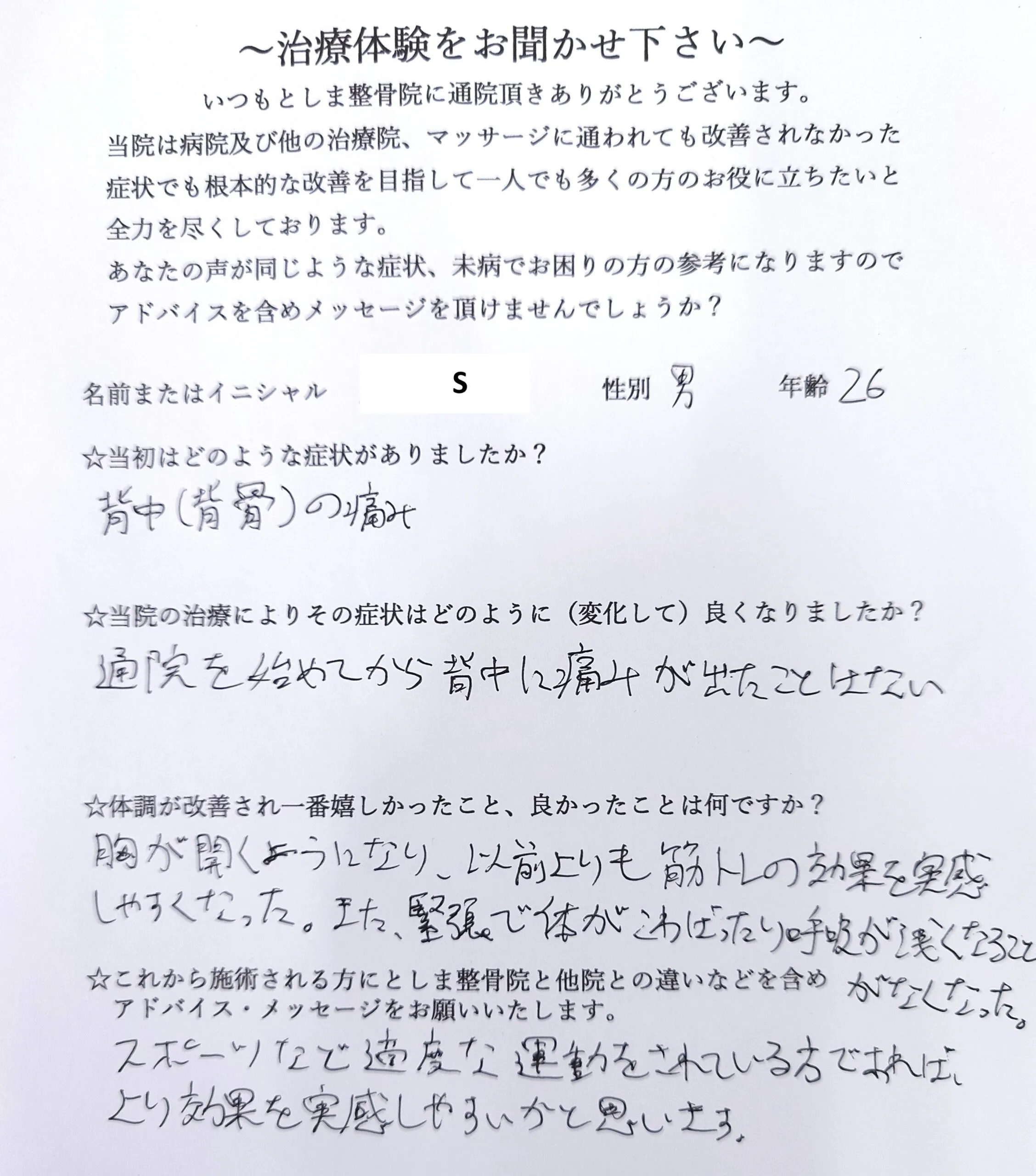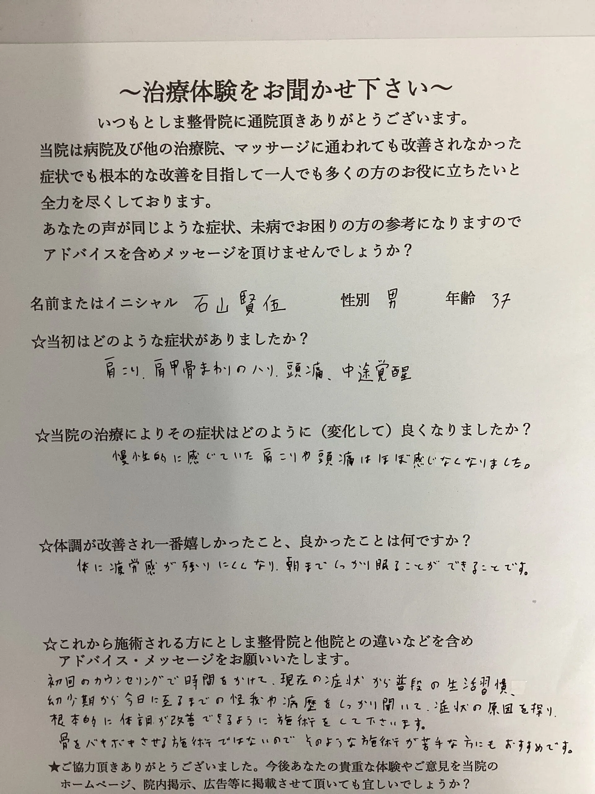 ☆これから施術される方にとしま整骨院と他院との違いなどを含めアドバイス・メッセージをお願いいたします。